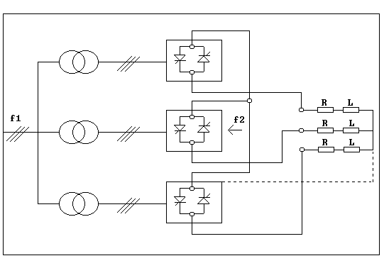 - La tensión de la carga es producida realizando una modulación del ángulo de disparo de los tiristores. Además, por su principio de funcionamiento tiene la frecuencia de salida bastante limitada, la que solamente puede alcanzar una fracción de la frecuencia de entrada. Generalmente, los motores sincrónicos que son alimentados por los cicloconversores tiene una frecuencia relativamente pequeña y variable en un rango de [0-15] Hz.